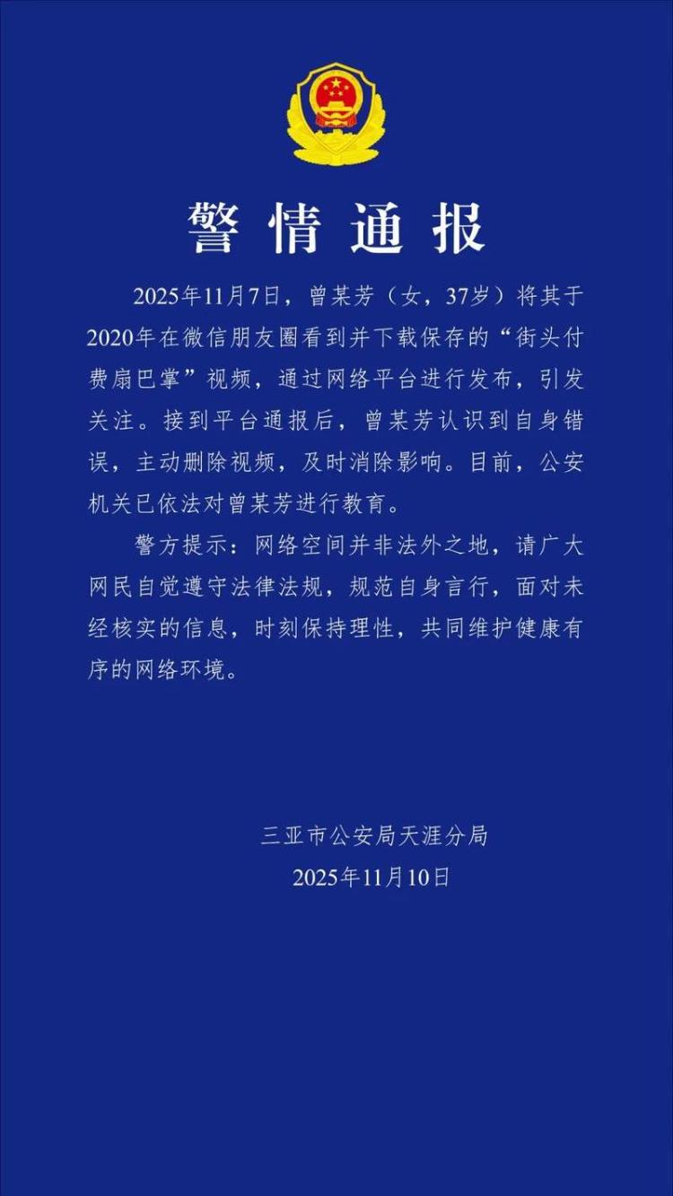 11月10日,三亚市公安局天涯分局发布警情报告。 2025年11月7日,曾木芳女士(女,37岁)因通过互联网平台在微信朋友圈发布自己2020年观看并下载的《街头付费打巴掌》视频而引起关注。收到平台通知后,曾某方认识到自己的错误,主动删除视频并及时删除影响。目前,公安机关正在依法对曾牧吉进行教育。