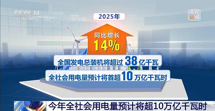 记者昨日在全国能源工作会议上获悉,今年全国电力供应将保持安全稳定,全社会用电量预计将突破10万亿千瓦时。根据国家能源局最新预测数据,到2025年,全国发电总量预计将突破38亿千瓦,比上年增长14%,全社会用电量预计首次突破10万亿千瓦时。从纵向看,这大约是我们2015年全社会用电量的两倍。从横向看,这比欧盟、俄罗斯、印度、日本所有社会用电量的总和还要大。 10万亿千瓦时的背后,是中国经济的活力。今年以来,高技术产业和装备装备制造业继续引领用电量增速。 1-11月,新能源汽车生产用电量和风力发电设备生产用电量预计比上年分别增长20%和30%以上。 1-11月,互联网及相关服务业用电量同比增长30%以上,充电和交换服务业用电量同比增长近50%。非化石能源消费率超额完成“十四五”规划目标。 “十四五”规划纲要提出,到2025年底,非化石能源占能源消费总量比重提高到20%左右。记者昨日获悉,这一目标将在国家能源商会中实现。国家能源局局长王洪志国家发改委:绿色能源、低碳能源转型步伐加快,非化石能源消费比重将突破20%目标。今年,我国能源投资强劲增长,正走向绿色新趋势。预计全年重大能源项目投资3.54万亿元,比上年增长11%。核电、陆上风电、分布式太阳能发电投资尤为强劲,新能源存储、充换电基础设施、氢电投资也快速增长。新能源将实现更高质量的辉煌发展。目前,我国第一批风能、太阳能发电基地已基本建成投产,第二批、第三批也已建成并投产约5000万千瓦。贯穿整个全年预计该地区新增风电、太阳能发电装机容量约3.7亿千瓦,利用率预计保持在94%以上。风能和太阳能发电约占社会总电力消耗的22%。到“十五五”末,新增发电装机占比将超过50%。记者还了解到,“十五五”末,即到2030年,我国新能源发电装机占比将超过50%,新能源发电装机将成为主要能源设备。国家能源牵引总局主要负责人介绍,到2030年,非化石能源消费比重达到25%,新增发电量比重超过50%,新能源体系初步建立。国家能源局局长王洪志:实现这些目标ls,能源行业将发生一些历史性变化,从量变到质变,能源活动将达到碳峰值。煤炭消费将度过高峰并进入停滞期,而石油消费将达到峰值。能源和电力需求的增长将主要由非化石能源满足。 “十五五”期间,我国将加大新能源基础设施建设力度,优化能源资源基地设计和流动模式。夯实煤炭供应基础,增强油气生产供应能力,提高电力供应保障水平。 2030年,“东西输电”容量将达到4台。超过2亿千瓦。油气管网总长度达到22万公里,四大战略油气进口通道进一步整合拓展。在同时,我国将推动发展更高品质的清洁能源,坚持风能、太阳能、水电、核能并举发展,加快智能电网和微电网建设,完善绿色能源消费体系,落实可再生能源最低比例消纳目标,加强产业转移和清洁能源协调。 (央视记者 孙媛)