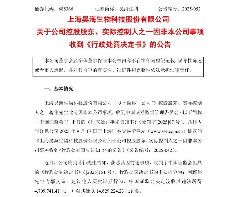 海报新闻记者赵恩报道 近日,上海昊海生物科技股份有限公司(以下简称“海海生物”)发布公告称,其控股股东之一、实际控制人姜伟先生收到中国证监会《行政处罚决定书》。因其内幕交易、推荐他人买卖证券,中国证监会决定没收其违法所得470.97万元,并处罚款1462.92万元,合计约1933.89万元。来源:上交所 昊海生物表示,姜伟是此次“行政处罚决定”的涉案个人,所涉事项与公司无关。姜伟不参与公司日常经营管理,该事项不会对公司经营、业务及日常财务产生重大影响。公司的 es。截至本公告日,公司各项商业生产经营正常有序。今年5月,姜伟因涉嫌内幕交易被移送证监会。当时公司公告称,姜伟将在证监会调查期间积极配合证监会的调查。 “据公司了解,此事与公司行为无关。” 9月17日,昊海生物发布公告称,姜伟收到中国证监会下发的《行政处罚预告通知书》。昊海生物成立于2007年,是一家从事医疗器械和医药产品研发、生产和销售的创新型科技公司。属于制造业制药建筑师。公司现有产品均为优质产品主要应用于四个主要工业领域:医学美容和伤口护理、眼科、粘弹性骨和关节补充剂、手术止血和防粘连。公司于2015年4月在香港联交所主板上市,2019年10月在上海证券交易所科创板上市。 资料来源:公司官网 根据公司披露的信息,公司控股股东及实际控制人为姜伟、尤杰。截至2025年第三季度末,两家公司合计持股约46%。 2024年,昊海生物实现营收26.98亿元,同比增长1.64%。归属于母公司净利润42亿元,比去年同期增长1.04%。经营活动产生的现金流量净额达到6.49亿元,同比增长2.23%。碧浩海otech表示,继续保持业务业绩稳定增长,强化行业市场地位,同时坚持独特创新和加大研发投入。不过,即使到2025年,公司业绩仍将面临压力。上半年营业利润13.04亿元,同比下降7.12%。其中,核心业务收入较去年同期下降7.52%。归属于上市公司股东的净利润2.11亿元,同比下降10.29%。今年前三季度,昊海生物销售额和净利润依然下滑,约为18.99亿元,同比下降8.47%。归属于母公司净利润3.05亿元,比上年同期减少10.63%。此外,归属于上市公司股东的扣除非经常性损益的净利润第三季度为5050.73万元,同比下降44.54%。昊海生物表示,报告期内,受国内消费需求不足、价格竞争、税率调整等因素影响,集团销售收入较去年同期有所下降。